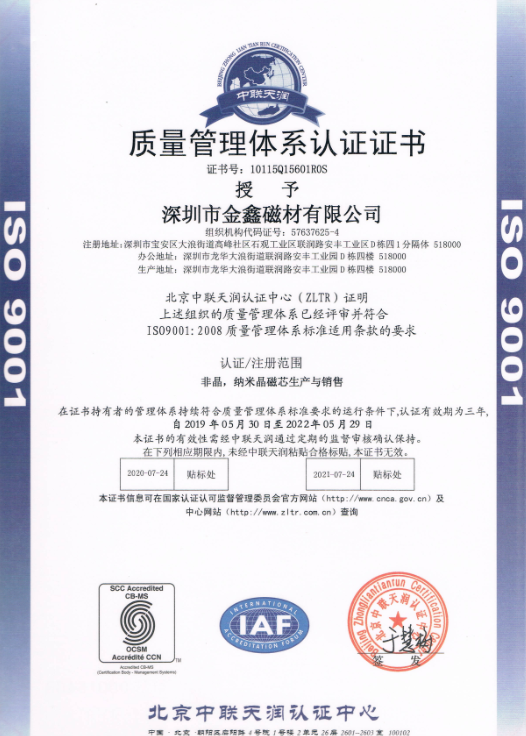 熱烈祝賀金鑫磁材通過國家ISO9001:2008質量管理體系認證